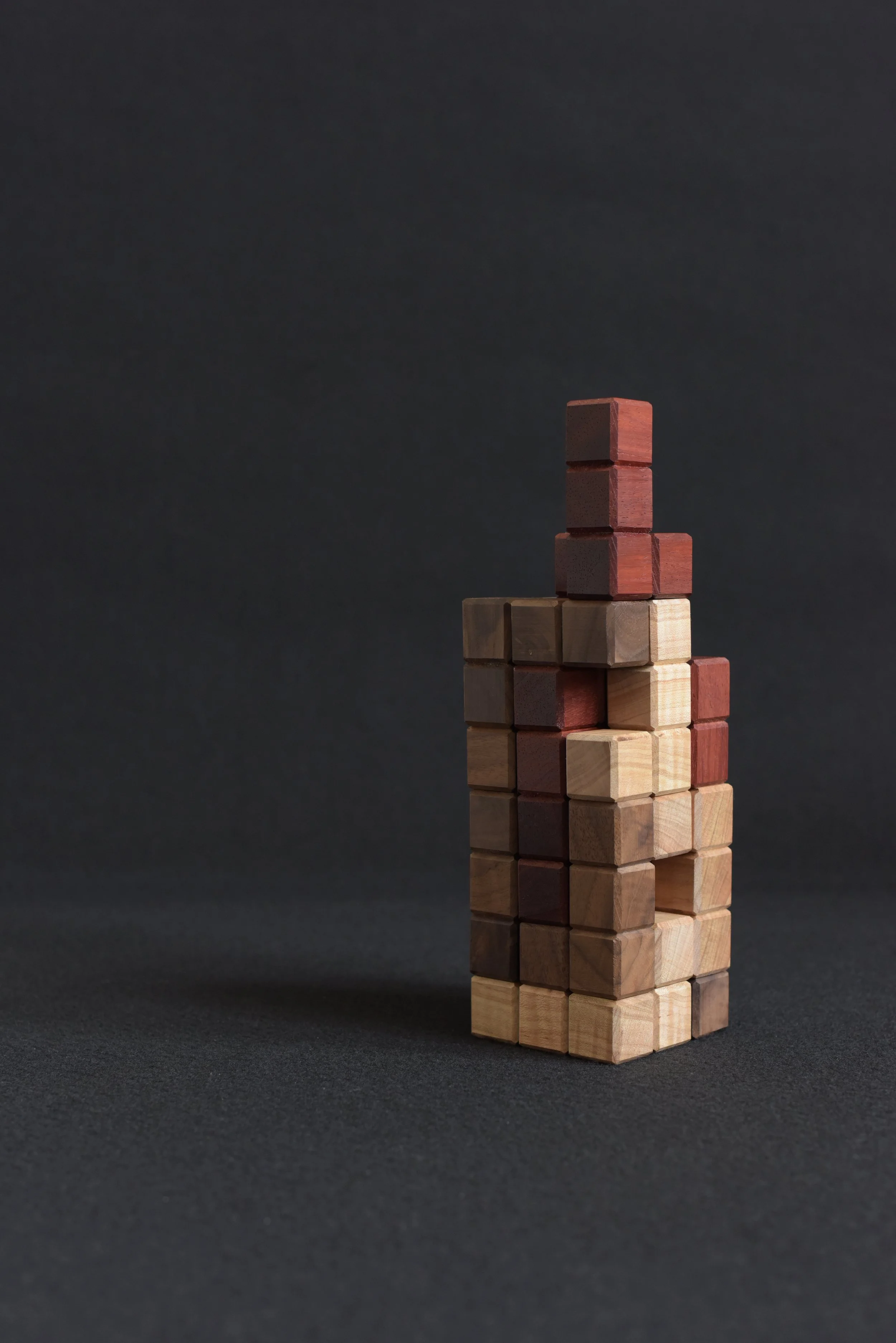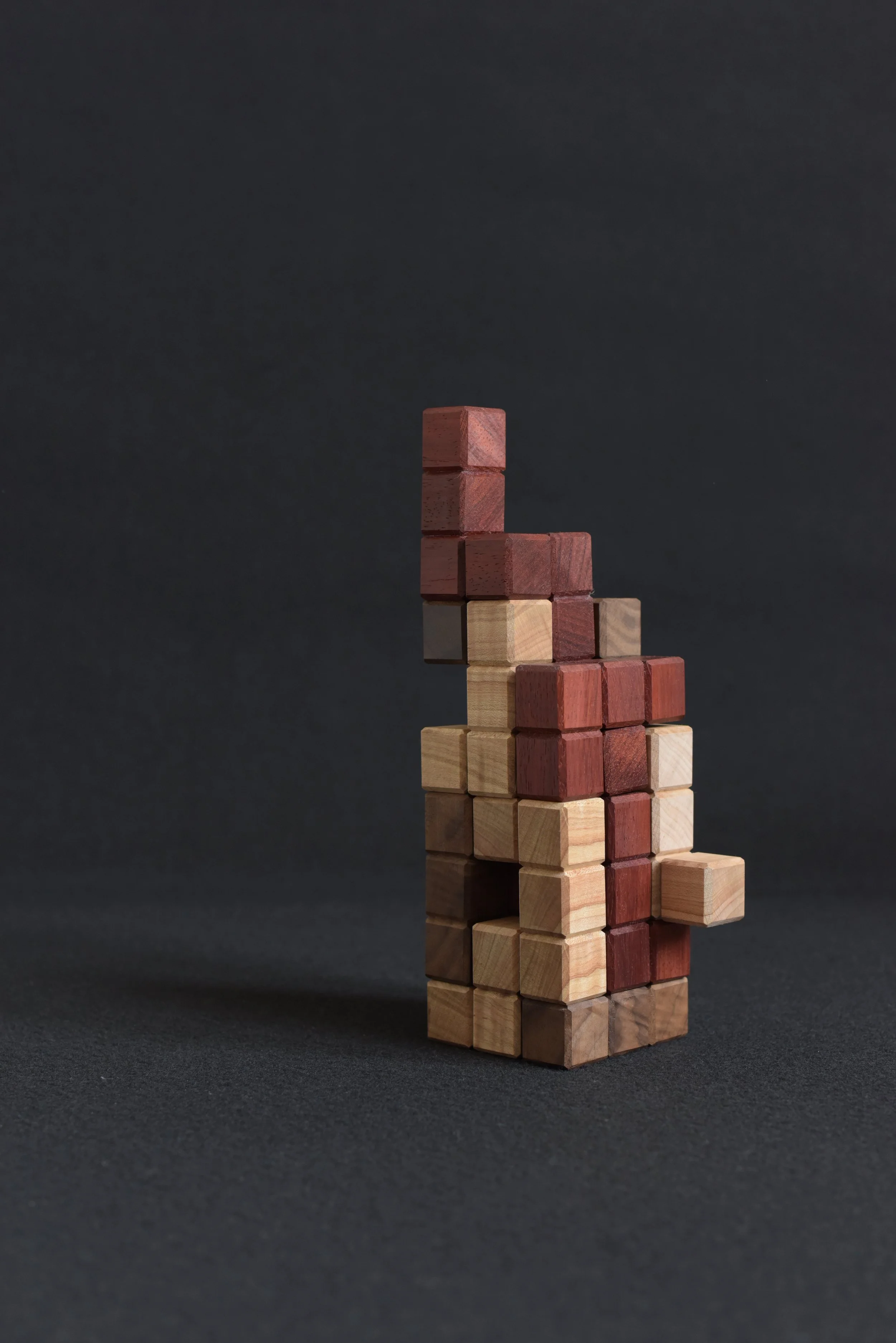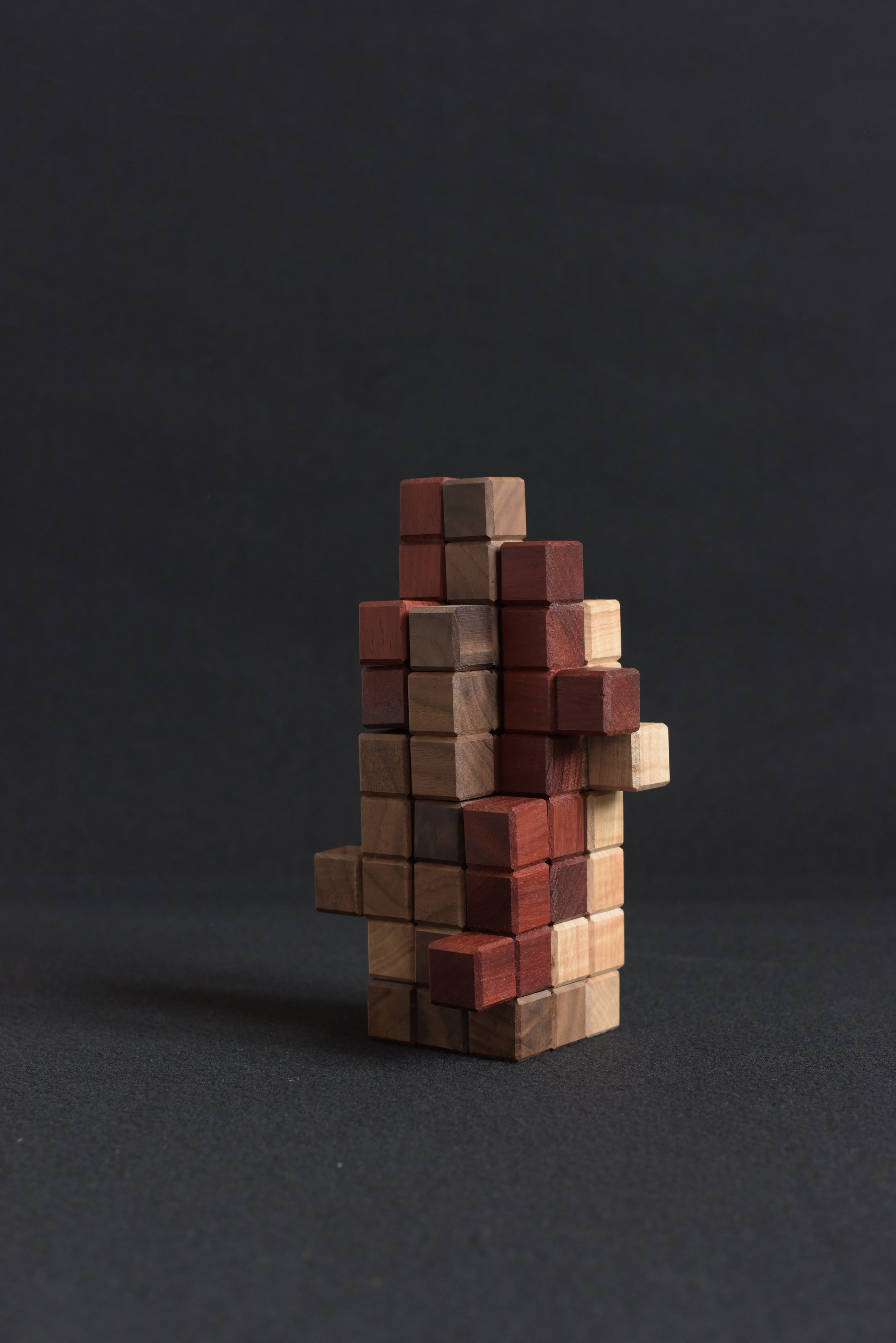 Each player chooses a unique wood species and takes turns placing L-shaped pieces so that they touch at least one face from the other players’ pieces.